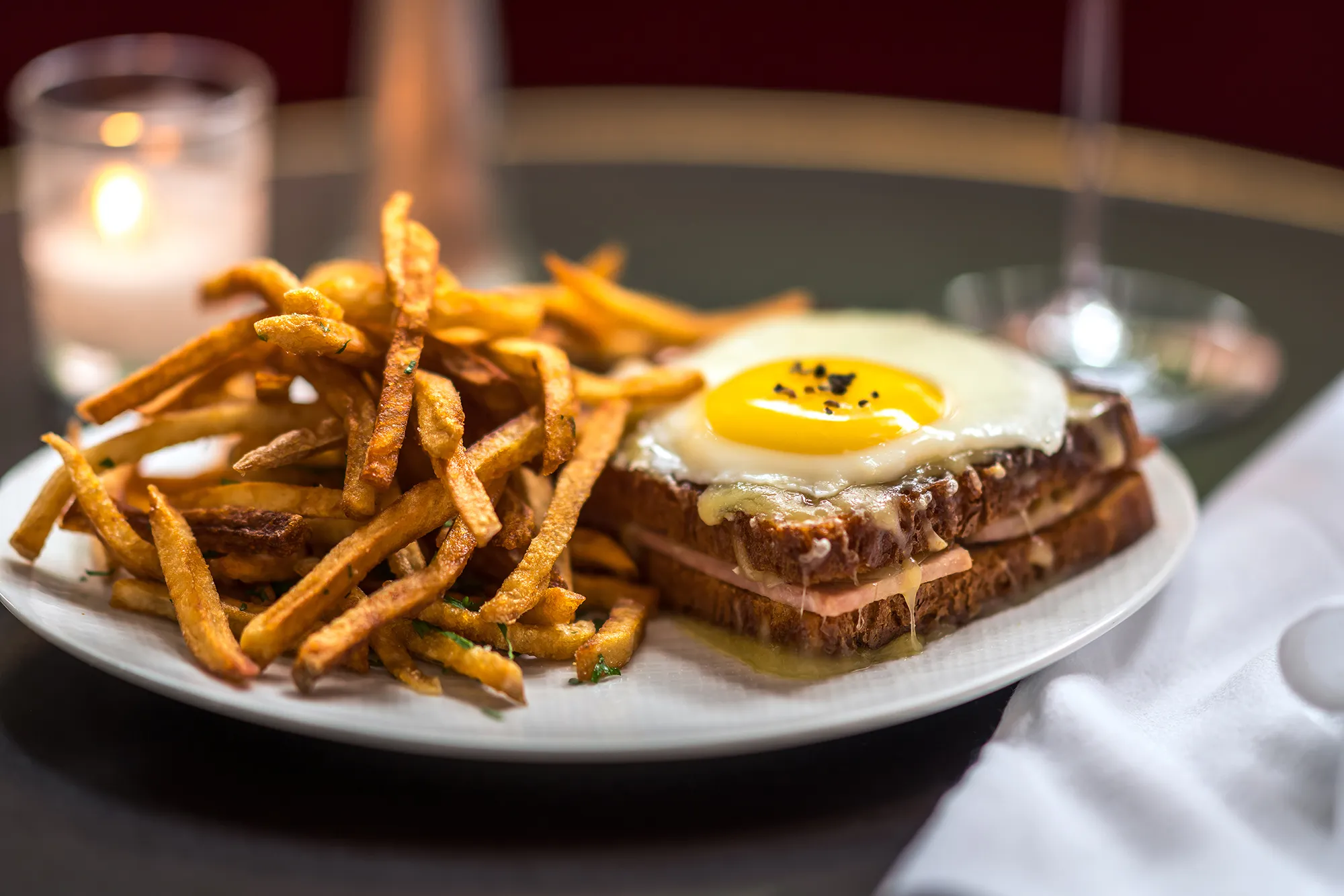Pain doré, jambon, emmental fondant et œuf fermier au plat . Servi avec des frites maison.