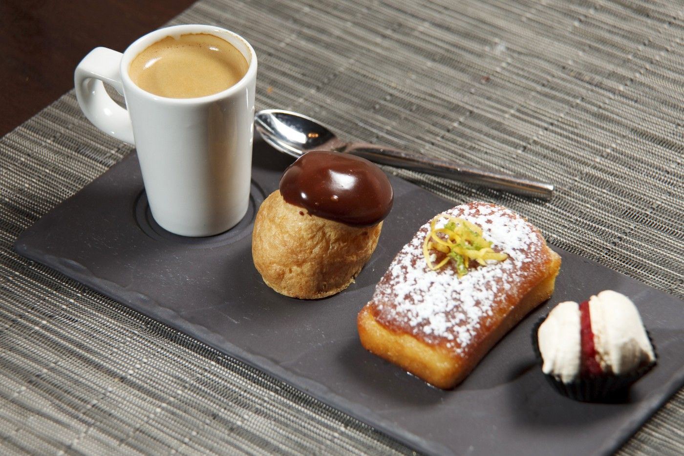 Un espresso accompagné de trois douceurs maison : Choux, financier et macaron.
