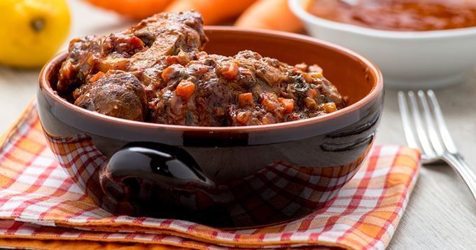 Bœuf mijoté au vin rouge avec légumes fondants et aromates. Servie avec des pommes de terre.