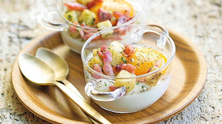 Œuf cuit au four dans une crème onctueuse, avec des ingrédients savoureux selon l’inspiration du chef.