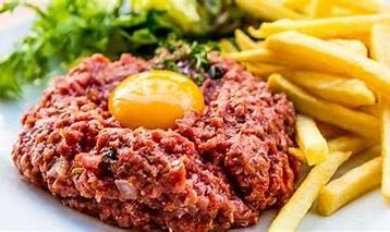 Bœuf Charolais haché accompagné de frites maison croustillantes et d’une salade verte fraîche.
